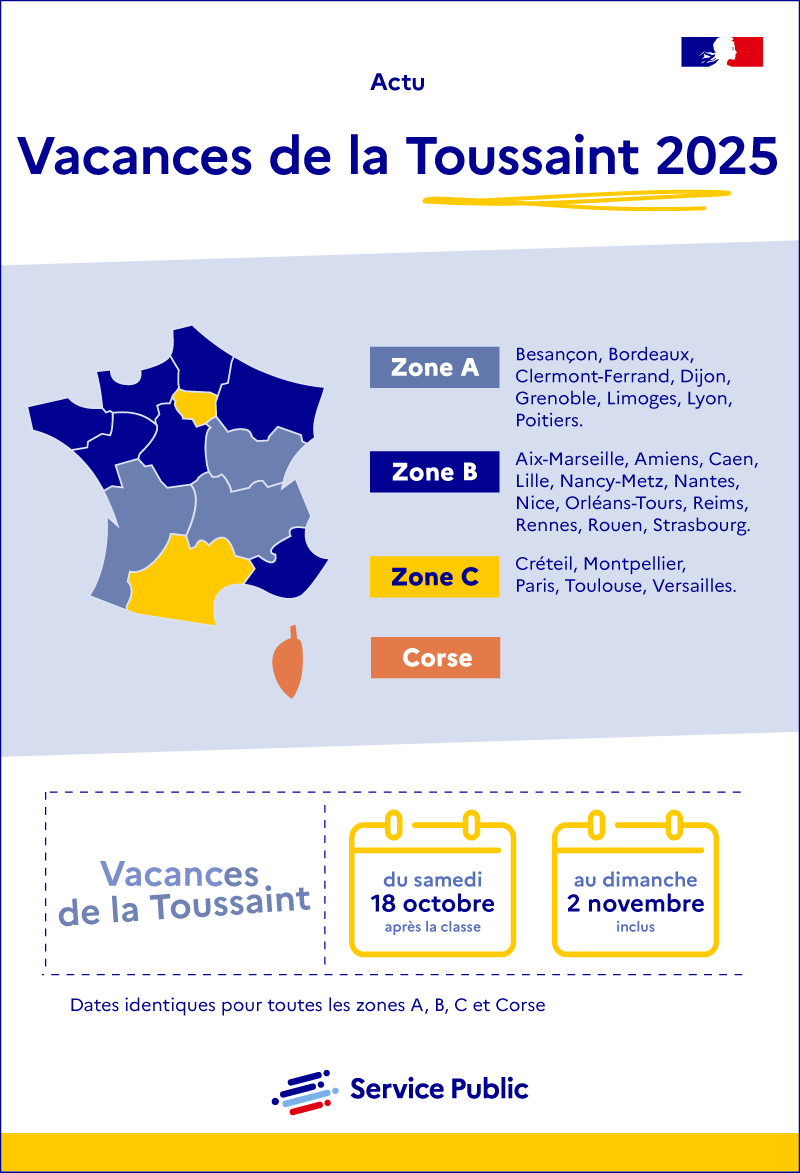 Écoles, collèges, lycées : les vacances scolaires de la Toussaint sont identiques quelle que soit la zone concernée. Elles commencent le samedi 18 octobre après la classe et les cours reprendront le lundi 3 novembre.