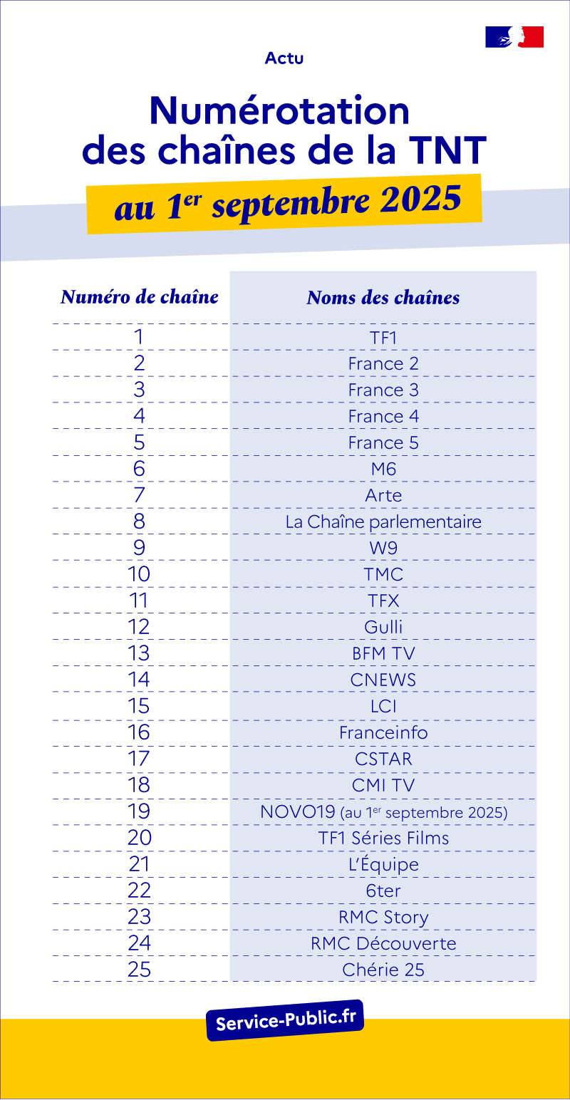 Le 1er septembre 2025, une nouvelle chaîne intègre la TNT. Depuis le 6 juin, la nouvelle numérotation des chaînes de télévision à vocation nationale diffusées sur la télévision numérique terrestre (TNT) est effective.