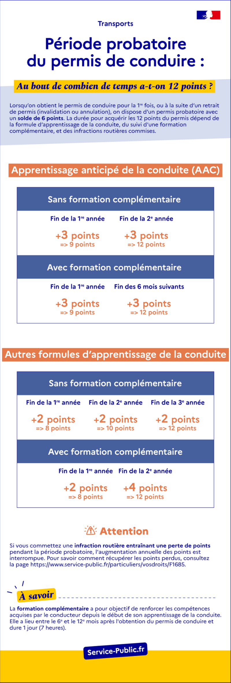 Warning: if you commit a traffic offense resulting in a loss of points during the probationary period, the annual increase in points is interrupted. To learn how to recover lost points, visit service-public.fr https://www.service-public.fr/particuliers/vosdroits/F1685