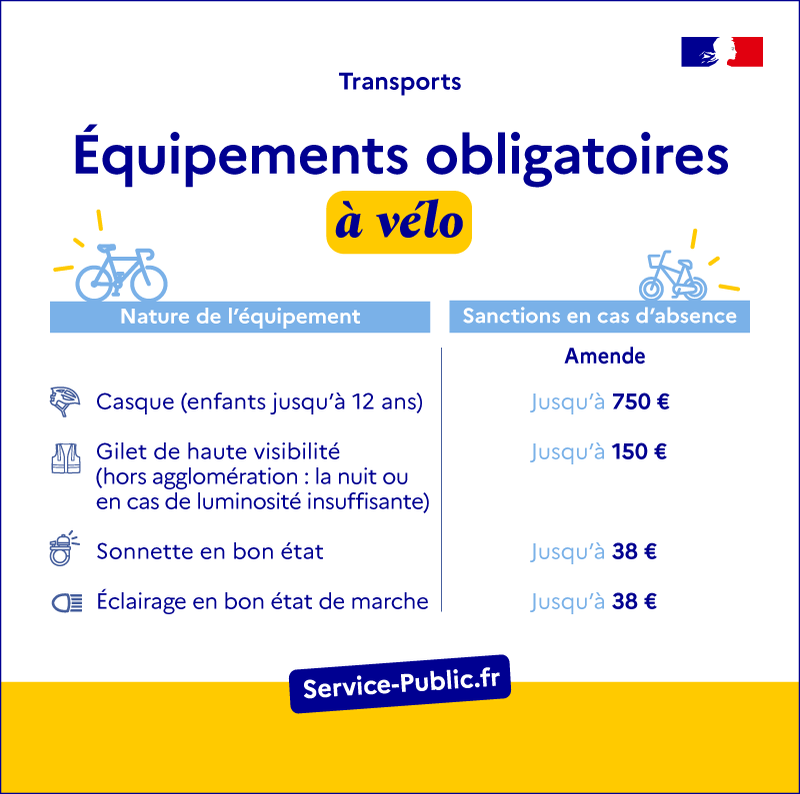 Casque. Un enfant de moins de 12 ans doit porter un casque à vélo. Ne pas respecter cette obligation est puni par une amende pouvant aller jusqu'à 750 €.