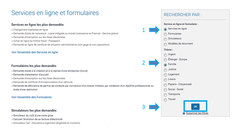 Pour trouver un service en ligne proposé sur le site Service-Public.fr, nous vous invitons à vous rendre directement dans la rubrique « services en ligne et formulaires » puis à procéder à votre recherche de la manière suivante :